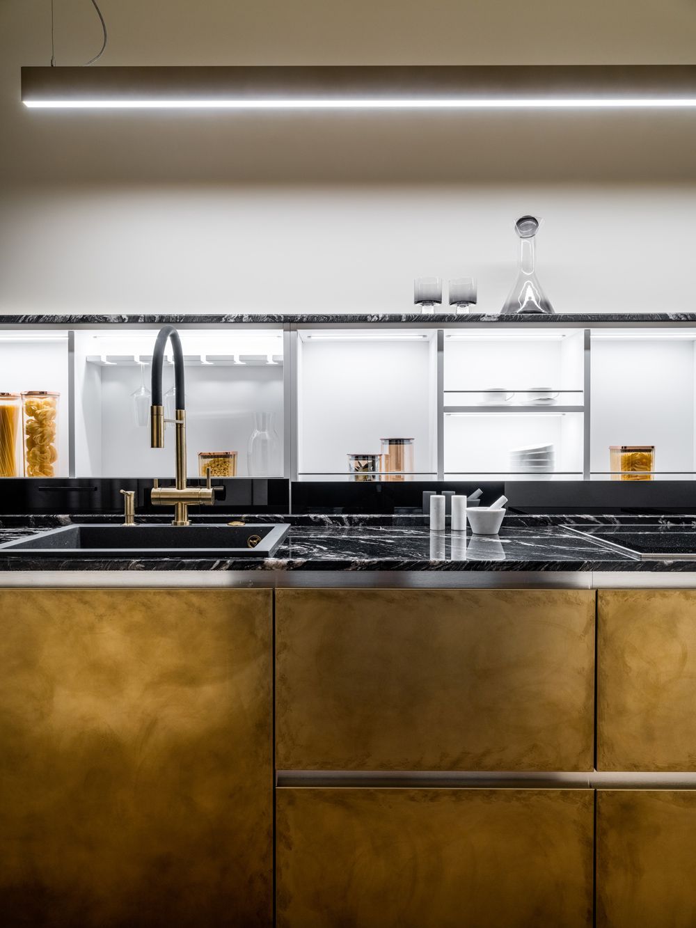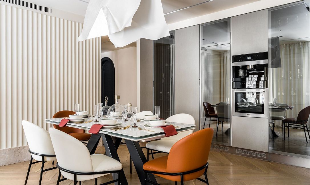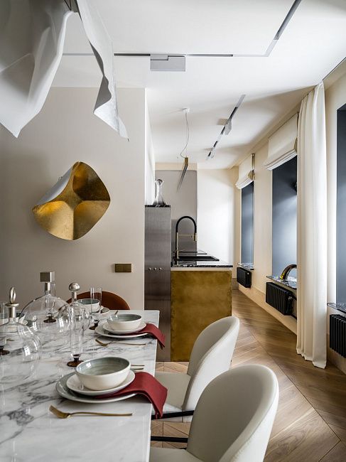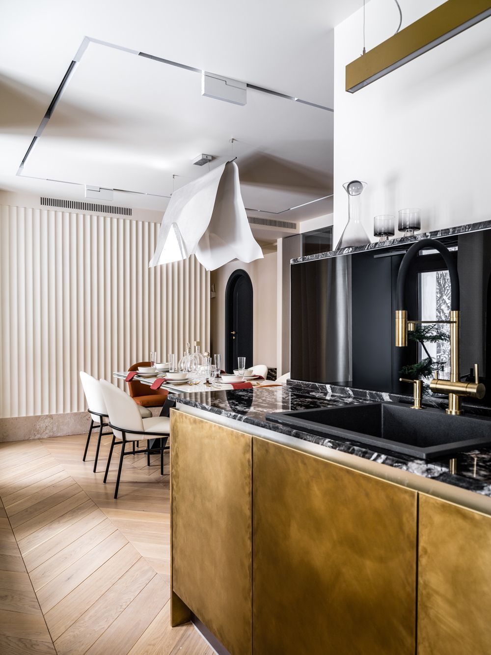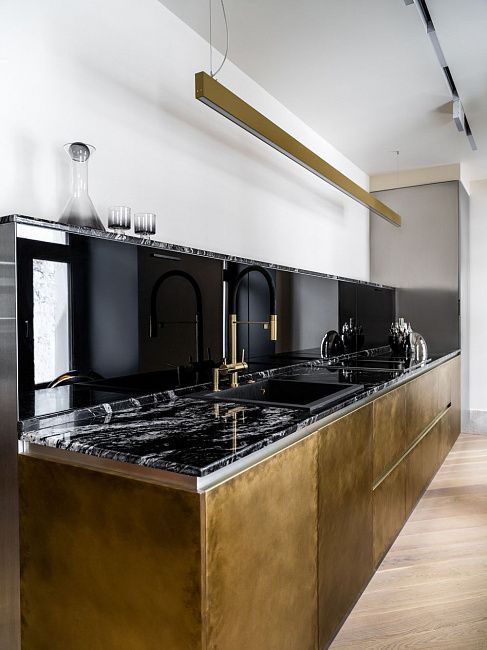 Кухню выбрали с интересной, уникальной отделкой: здесь соединились натуральная латунь, нержавеющая сталь, стекло и керамика. Столешницу выполнили из натурального гранита с черно-белыми прожилками. Верхние шкафы заменили невысоким рядом шкафов-запасниц в зоне фартука и оснастили их дополнительной подсветкой. Часть хранения, в том числе и крупную бытовую технику, вынесли в колонны, установленные вдоль стены в зоне столовой.